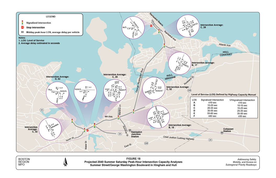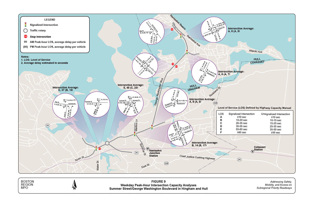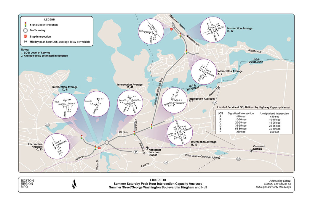 Staff estimate that the North Street intersection operates at LOS D in the midday peak hour with an average delay of about 40 seconds per vehicle; and that the critical westbound approach deteriorates to LOS F, with an average delay of nearly one-and-a-half minutes. The Route 3A rotary operates at LOS E, with an average delay of nearly 45 seconds per vehicle, and maintains the same LOS as the weekday AM peak hour. However, staff estimate that the average delay on the northbound approach increases to nearly two minutes; this is because, under existing rotary traffic operations, the heavy eastbound traffic (toward Nantasket Beach) consistently blocks the approach.