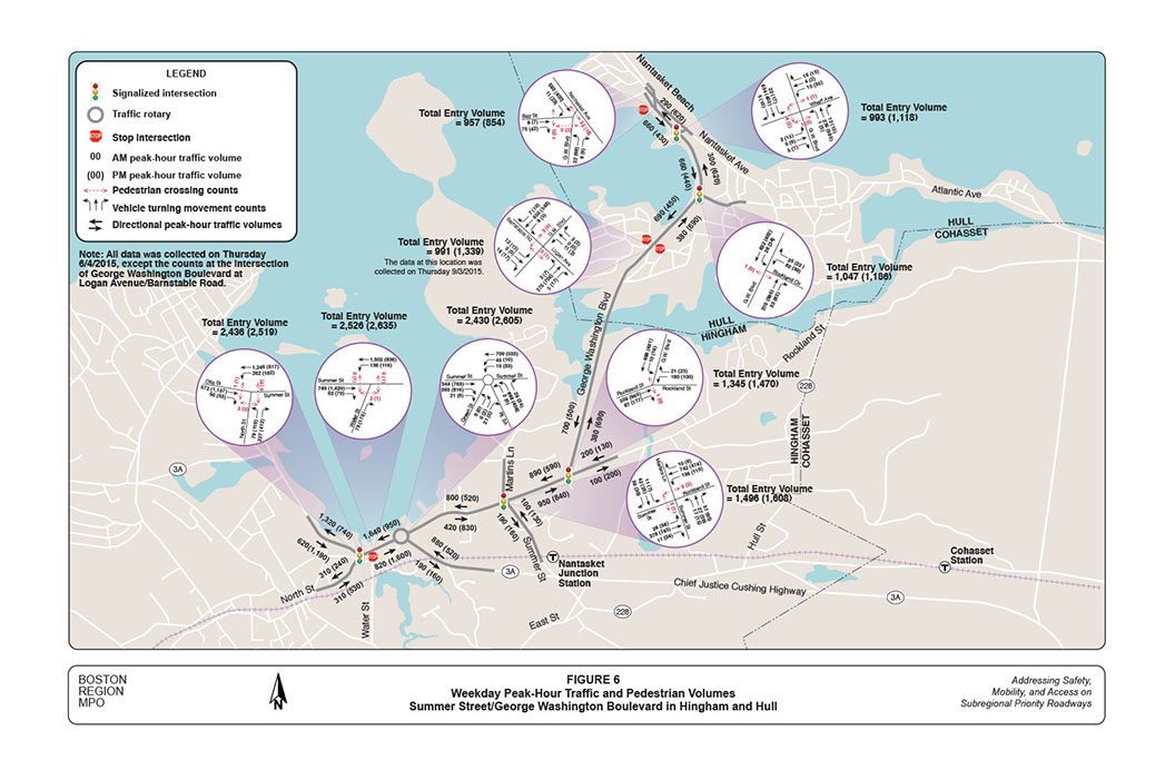Figure 6 shows the weekday peak-hour traffic and pedestrian volumes at major intersections in the corridor. Entry volumes at these intersections vary from 1,000 vehicles per hour at the intersection of George Washington Boulevard at Wharf Avenue to 2,600 vehicles per hour at Route 3A Rotary, and generally are somewhat higher in the evening than in the morning.