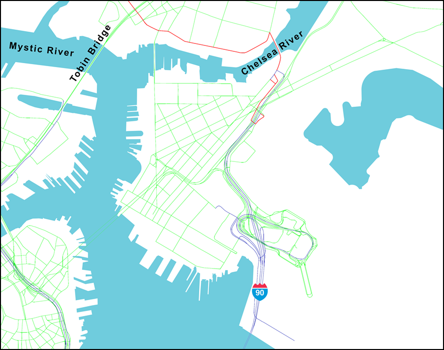 The recently completed East Boston Haul Road, highlighted in red, is a short distance south of the Chelsea River Bridge. MPO staff recommends that this new facility be incorporated into the NHFN and that the currently designated freight corridor on Bremen Street be removed.