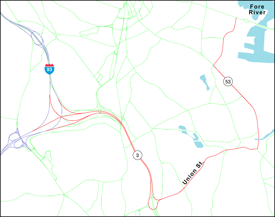 This proposed CUFC begins at the Braintree Split, where the limited-access Route 3 meets I-93 and the Southeast Expressway. The proposed CUFC includes Route 3 as far as Union Street, the first interchange toward the southeast. It follows Union and Commercial streets to Route 53, turns north and enters the industrial area on East Howard Street. The end of the CUFC would be at Route 3A at the western end of the new Fore River Bridge, now under construction.