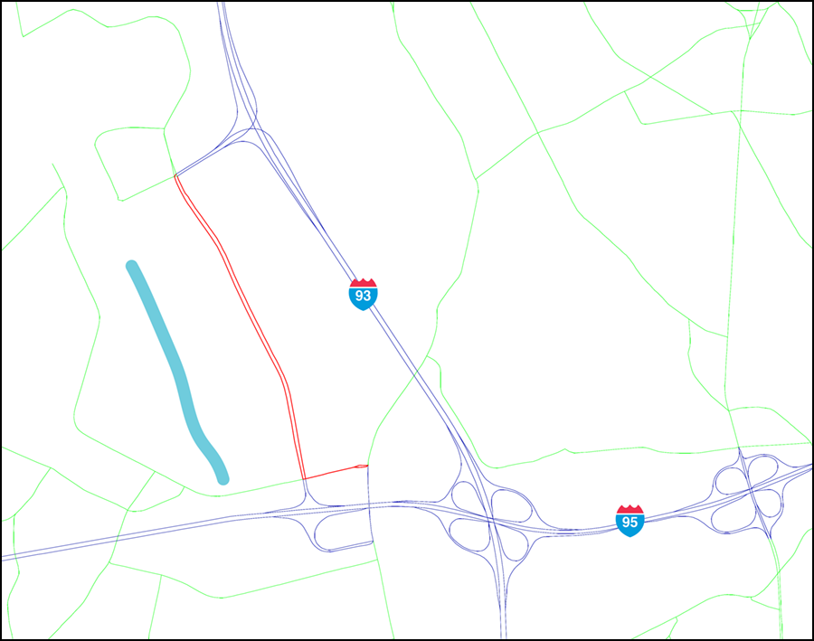 Green:        All other network roadways are shown in green. These include all roadways with a functional class of “collector” or higher, plus any local streets used for fixed-route bus service.