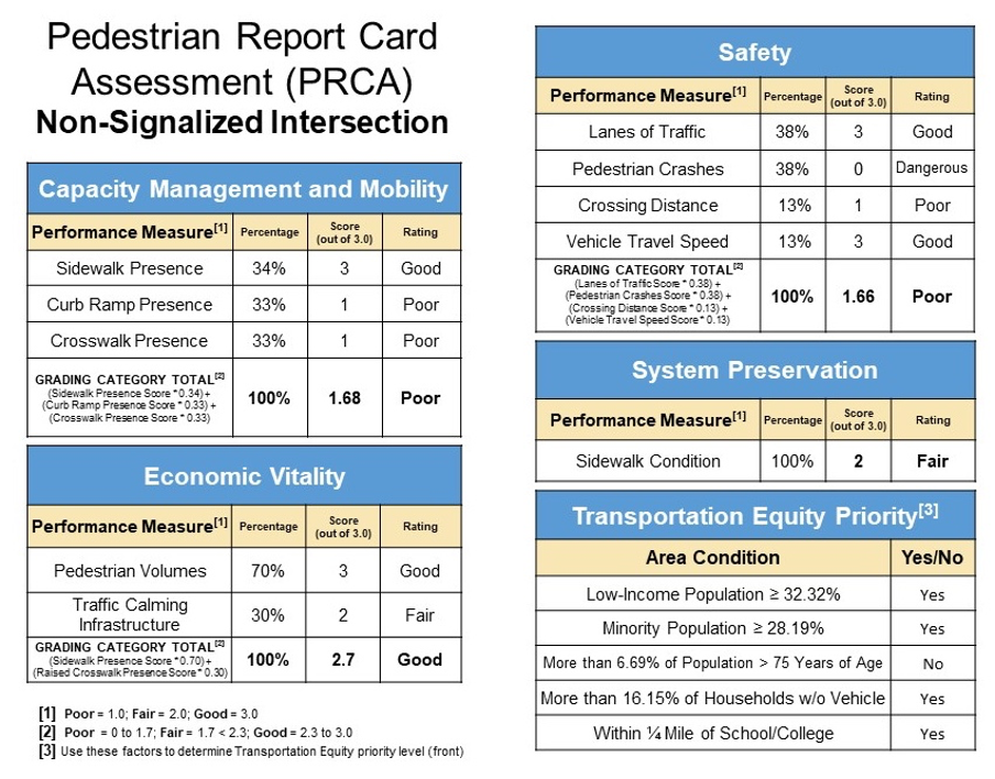 Without bicycle facilities at the location, it was impossible for either roadway to earn points for bicycle System Preservation, which led to another failing grade. Overall, the intersection was considered a High Priority area for pedestrian transportation equity because the proportions of all four populations at the location (low income, minority, youth, and zero-vehicle households) exceed the regional averages and the intersection was located within a quarter mile of a school.