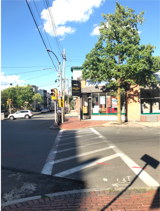 View from curb ramp on intersection’s northwest corner. There is no curb ramp on the southwest corner for the Chestnut Street crossing.