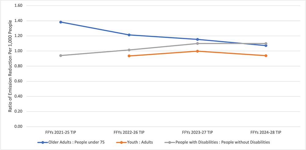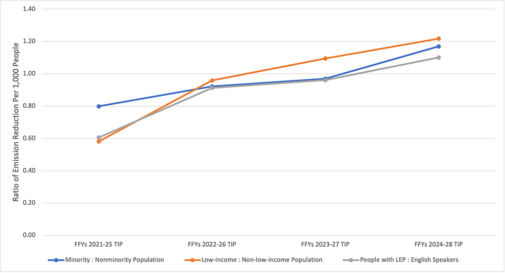 Figures 6-9a and 6-9b compare the projected emissions reduction that would result from the implementation of Regional Target-funded projects between TE and non-TE populations. 6-6 The charts show the ratio of the emissions reduction between each TE population and the respective non-TE population and are shown for the FFYs 2021–25, 2022–26, 2023–27, and 2024–28 TIPs. Ratios above one indicates that the TE population would receive greater air quality benefits than the non-TE population. Emissions measured for these figures and Table 6-3 include carbon monoxide, volatile organic compounds, and nitrogen oxide.