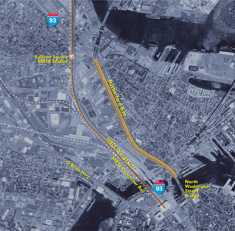 The Rutherford Avenue project seeks to transform the corridor’s highway-like design into a multimodal urban boulevard. The Rutherford Avenue corridor in the Charlestown neighborhood of Boston extends about 1.5 miles from the North Washington Street Bridge to the Sullivan Square MBTA Orange Line station and then to the Alford Street Bridge at the Mystic River. The existing corridor consists of eight to 10 lanes of median-divided highway that facilitate high-speed automobile travel. Although this roadway layout served high volumes of traffic during construction of the Central Artery/Tunnel project, it now acts as a barrier to the neighborhood. The existing roadway creates significant challenges and safety issues for pedestrians and bicyclists seeking to reach various destinations, including Bunker Hill Community College, Paul Revere Park, the Hood Business Park and Schrafft’s Center employment areas, and MBTA rapid transit stations.
