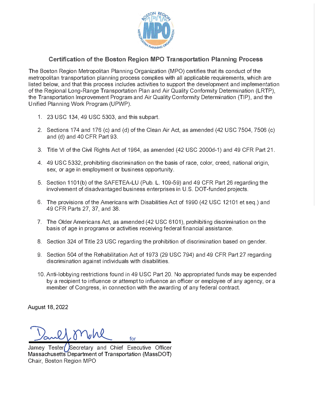 The most recent reauthorization of the surface transportation law is the new Bipartisan Infrastructure Law (BIL). The BIL sets policies related to metropolitan transportation planning. The law requires all MPOs to carry out a continuing, comprehensive, and cooperative (3C) transportation planning process. As part of its 3C planning process, the Boston Region MPO annually produces the Transportation Improvement Program (TIP) and the Unified Planning Work Program (UPWP). These documents, along with the quadrennial Long-Range Transportation Plan (LRTP), are referred to as certification documents and are required for the MPO to be certified as meeting federal requirements; this certification is a prerequisite for receiving federal transportation funds. In addition to the requirement to produce the certification documents, the MPO must establish and conduct an inclusive public participation process, as well as maintain travel models and data resources to support air quality conformity determinations, transportation equity analyses, and long- and short-range planning work and initiatives.