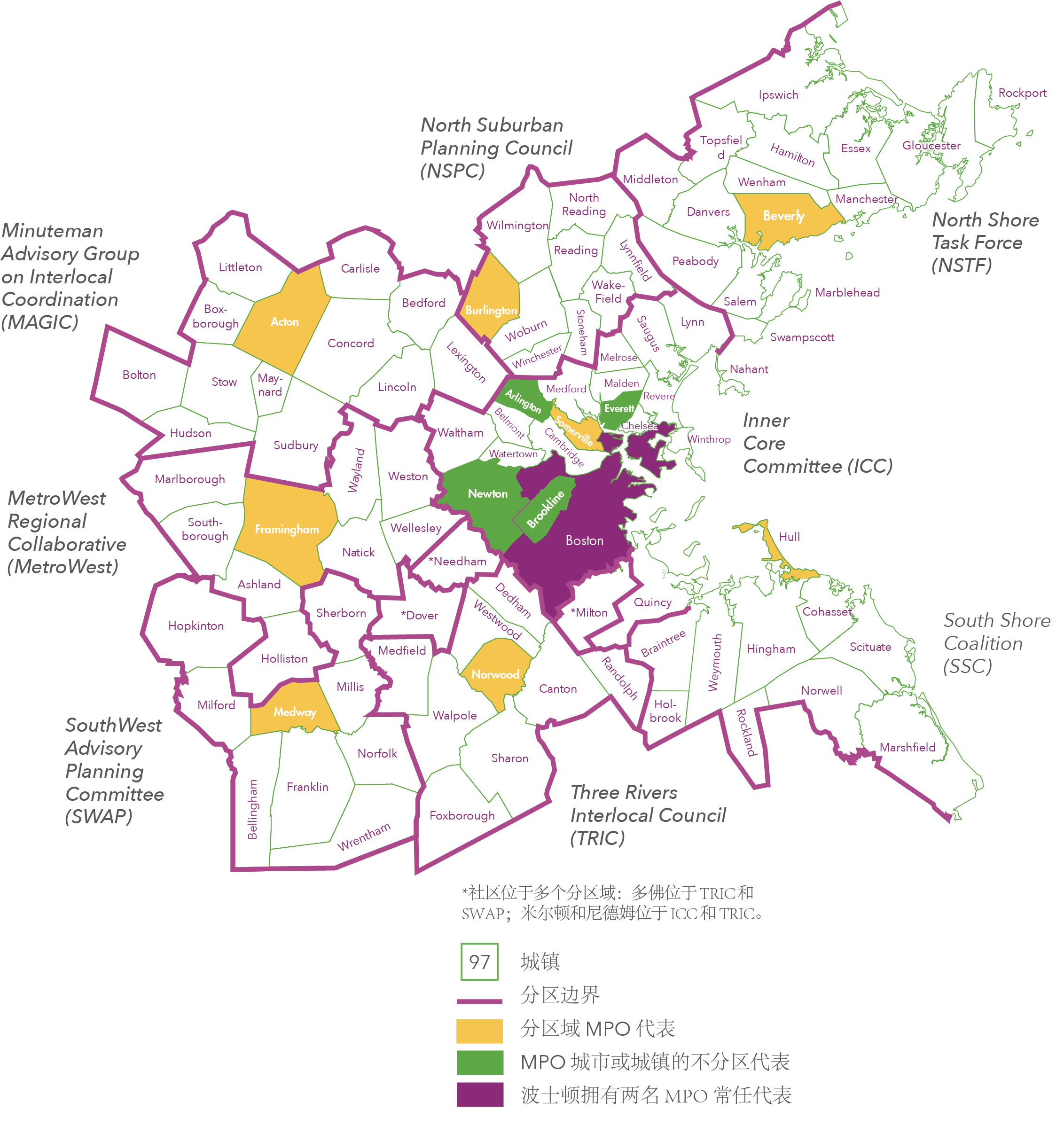 波士顿地区 MPO 的规划范围横跨 97 个城镇,以波士顿为起点,北至伊普斯威奇,南至马什菲尔德,西至 495 号州际公路。