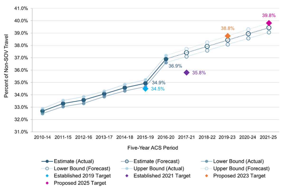 The metric for average travel time for drive trips, while not fully mitigated, does show improvements for the minority population and is headed in the right direction. The metric for access to parks/open space, however, is going in the wrong direction as it shows the low-income population with less access to parks than the non-low-income population.