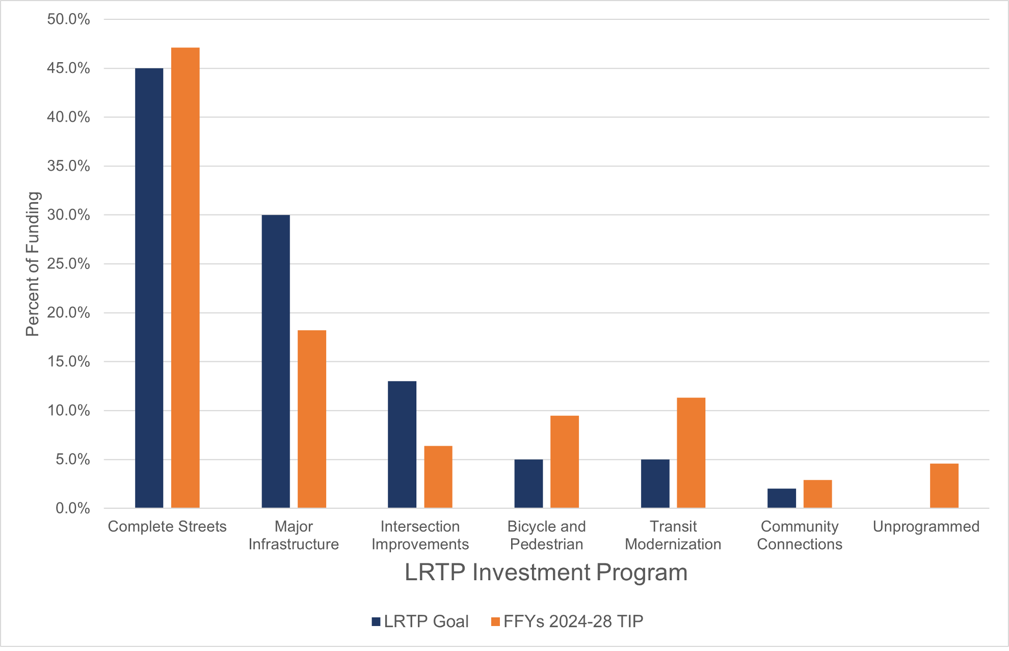 Ao tomar decisões sobre quais projetos financiar, a MPO considera como a alocação de fundos para cada programa de investimento se compara às metas de financiamento descritas no atual Plano de Transporte de Longo Alcance (LRTP) da MPO, Destination 2040. As metas de financiamento para programas de investimento estabelecidas no LRTP refletem os tipos de projetos que a MPO procura financiar para ajudá-lo a atingir suas metas e objetivos para a região, desde aumentar a segurança para todos os usuários até promover mobilidade e acessibilidade em toda a região. Mais informações sobre as metas e objetivos da MPO estão disponíveis no Capítulo 1, e uma comparação entre as metas do programa de investimento LRTP e os níveis de financiamento do programa no TIP dos FFYs de 2024–28 é mostrada na Figura ES-2.