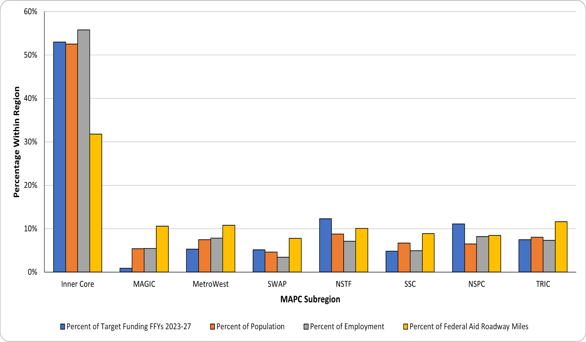 Finalmente, uma vez satisfeitas essas necessidades, o MassDOT aloca o financiamento restante entre as 13 MPOs do estado para programação. Este financiamento discricionário para MPOs é subalocado por fórmula para determinar os valores da Meta Regional. A MPO da região de Boston recebe a maior parte do financiamento da MPO no estado, com aproximadamente 43% dos fundos da Meta Regional de Massachusetts alocados para a região. O MassDOT desenvolve essas metas em consulta com a Associação de Agências de Planejamento Regional de Massachusetts (MARPA). Este TIP foi programado com a suposição de que a MPO da região de Boston terá entre US$ 129 milhões e US$ 158 milhões anualmente para valores de Metas Regionais, que consistem em financiamento federal e financiamento estadual para a correspondência local.