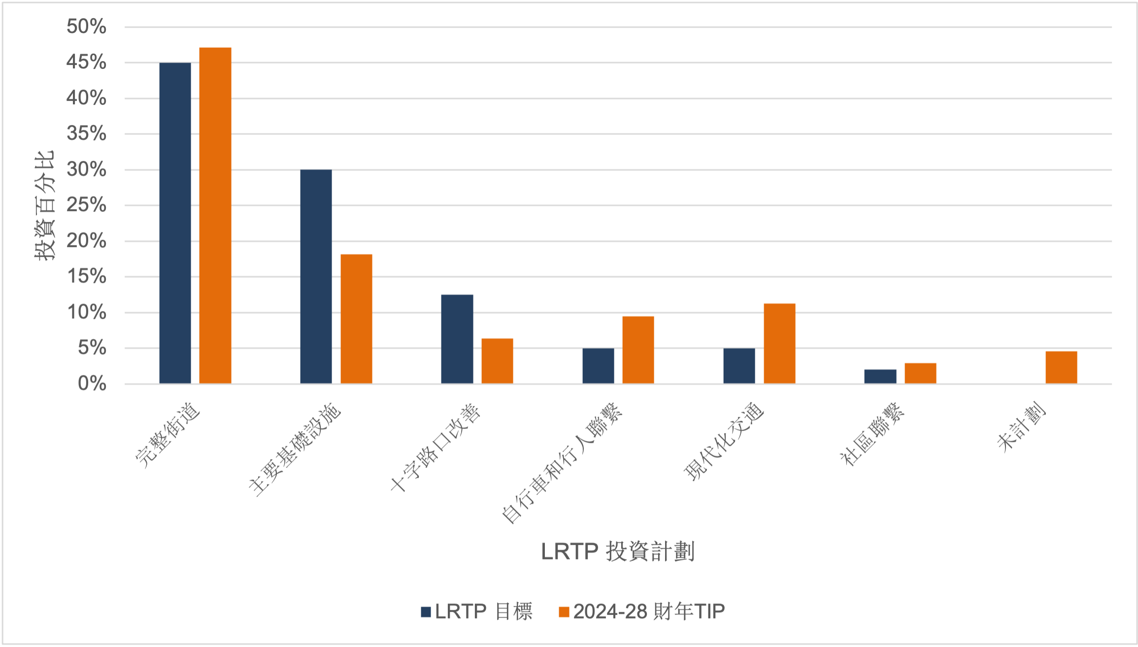 在决定投资哪些项目时,MPO 会参考 MPO 当前的长期交通计划 (LRTP)——Destination 2040 中概述的资金目标,考虑如何将资金分配给每个投资项目。LRTP 中的投资计划融资目标反映了 MPO 投资的项目类型,助力其实现在该地区的目标和宗旨,包括提高所有用户的安全性以及扩大整个地区的机动性和可达性。如需更多有关 MPO 目标和宗旨的信息,参见第 1 章。图 ES-2 对比了 2024-28 财年 TIP 中 LRTP 投资计划目标和计划资金水平。