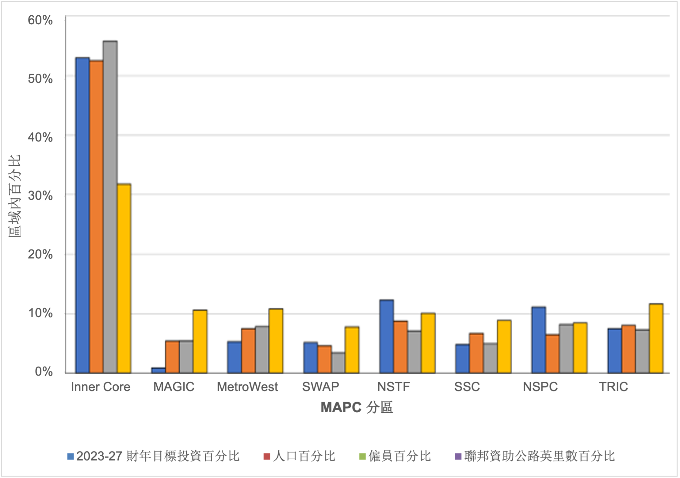 2024-28 财年 TIP 的投资将覆盖波士顿地区的 38 个城镇,包括人口密集的核心社区以及远离市中心的发展中的郊区。图 ES-3 展示了波士顿地区 MPO 管辖范围内八个分区的区域目标资金分配情况,如大都市区规划委员会 (MAPC) 所定义。该图还对比了资金分配与衡量各分区资金需求的关键指标,包括区域人口百分比、就业率以及各个分区的联邦资助公路计划英里数。
