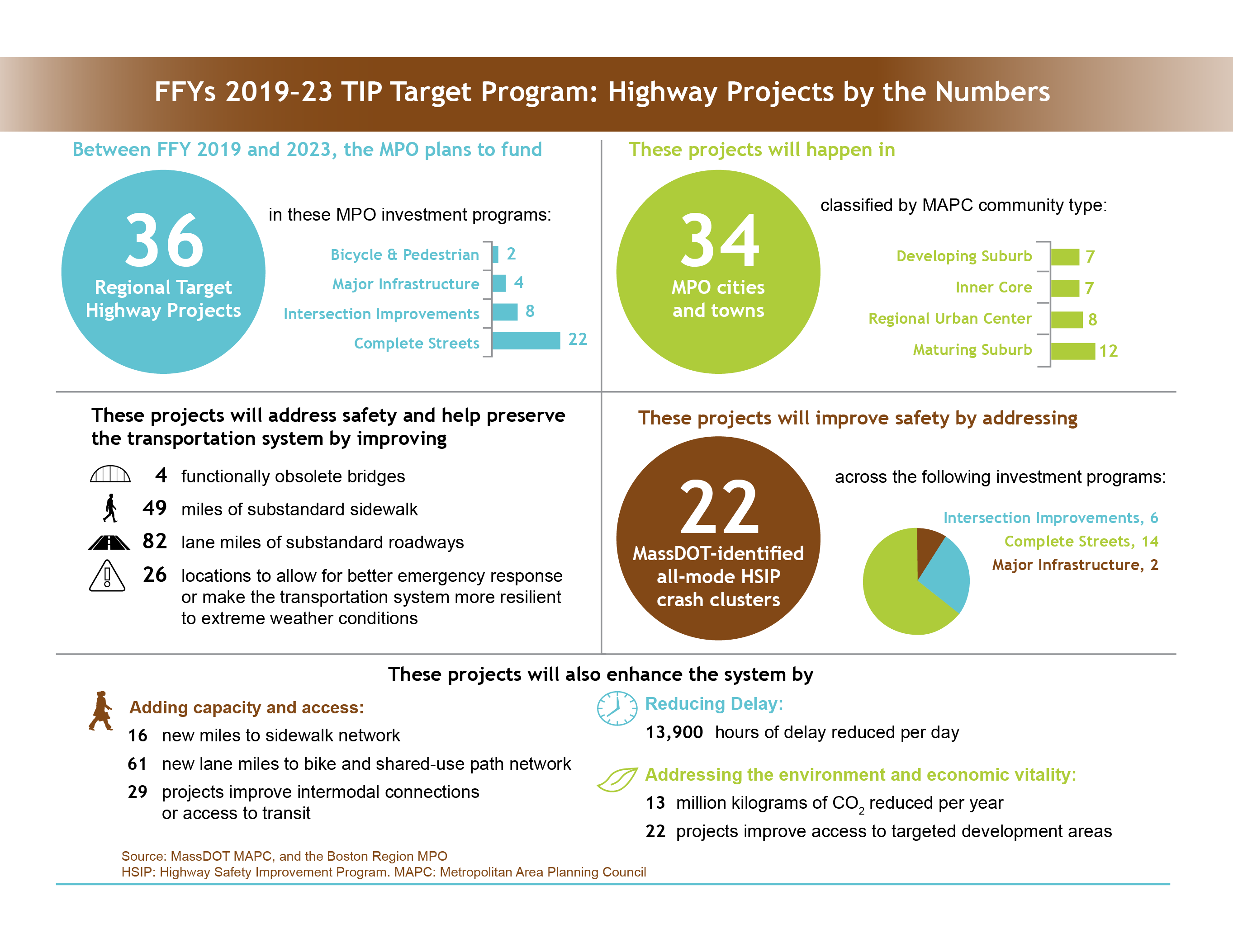 During FFYs 2019–23, the Boston Region MPO plans to fund 38 projects and programs with its Regional Target funding: