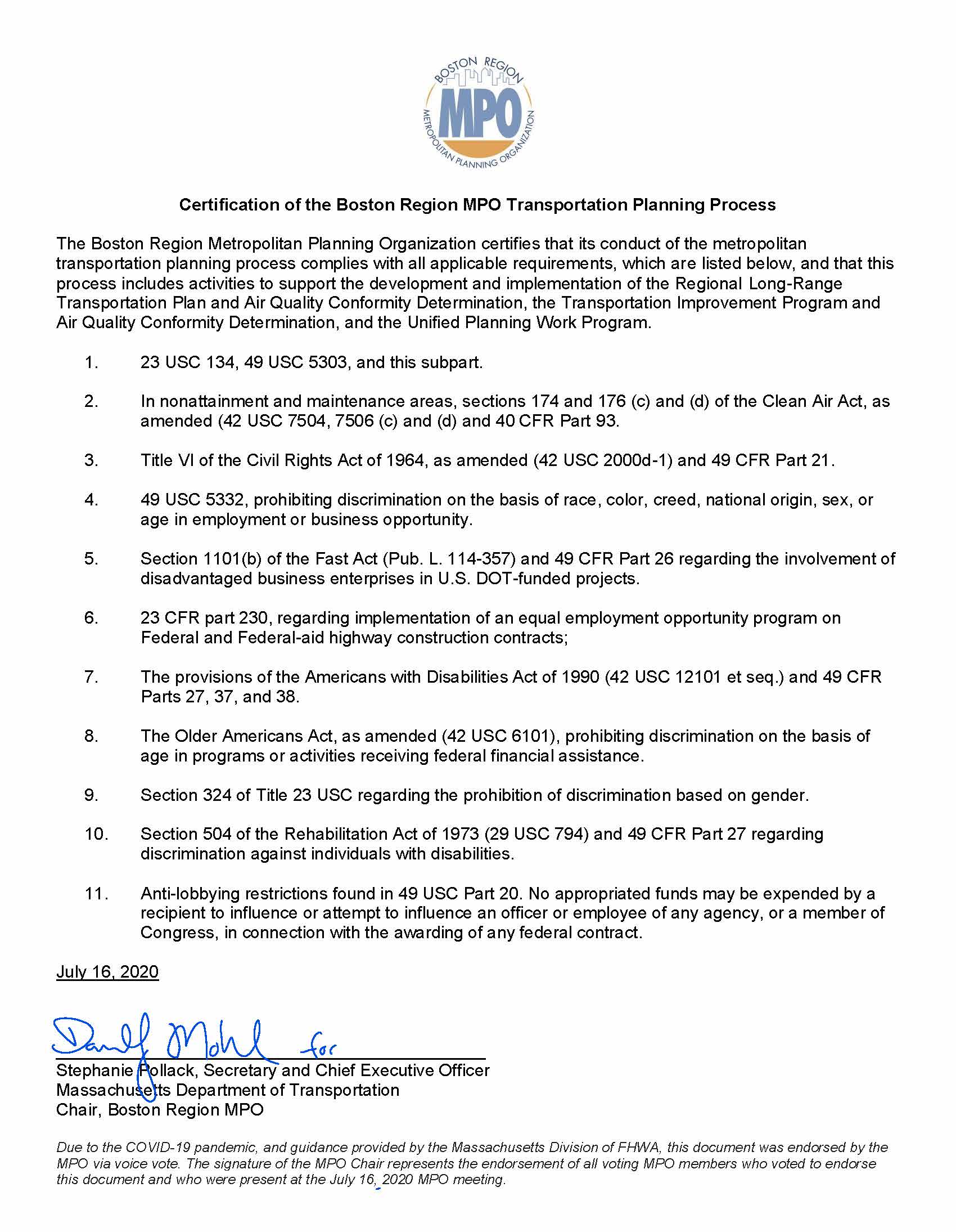 The most recent reauthorization of the surface transportation law is the Fixing America’s Surface Transportation (FAST) Act. The FAST Act sets policies related to metropolitan transportation planning. The law requires all MPOs to carry out a continuing, comprehensive, and cooperative (3C) transportation planning process. As part of its 3C planning process, the Boston Region MPO annually produces the Transportation Improvement Program (TIP) and the Unified Planning Work Program (UPWP). These documents, along with the quadrennial Long-Range Transportation Plan (LRTP), are referred to as certification documents and are required for the MPO to be certified as meeting federal requirements; this certification is a prerequisite for receiving federal transportation funds. In addition to the requirement to produce the certification documents, the MPO must establish and conduct an inclusive public participation process, as well as maintain transportation models and data resources to support air quality conformity determinations, transportation equity analyses, and long- and short-range planning work and initiatives.