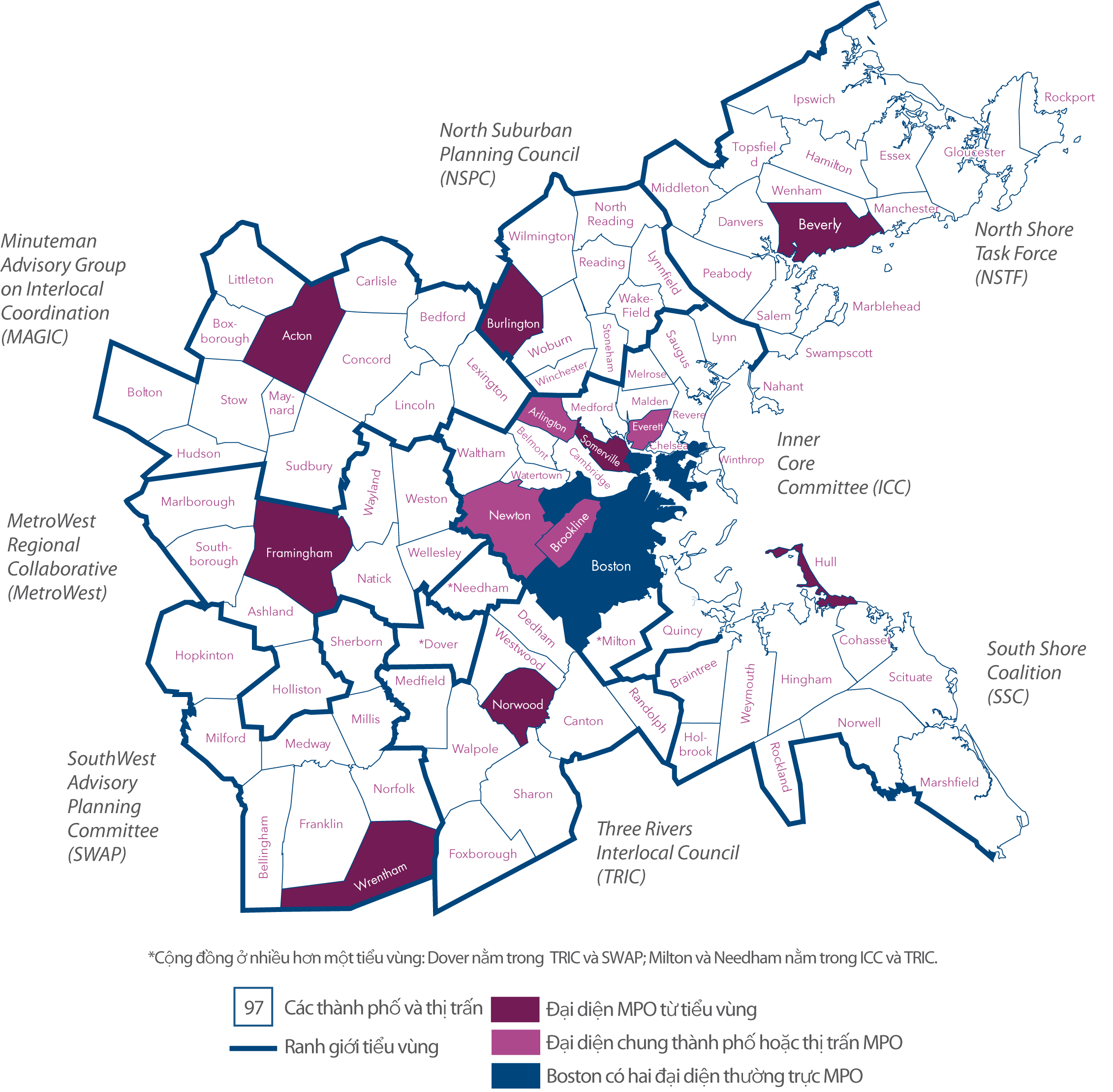 Khu vực quy hoạch của MPO Khu vực Boston trải dài trên 97 thành phố và thị trấn từ Boston về phía bắc đến Ipswich, phía nam đến Marshfield và phía tây đến Xa lộ Liên tiểu bang 495. Hình ES-1 hiển thị bản đồ các đô thị thành viên của MPO khu vực Boston.