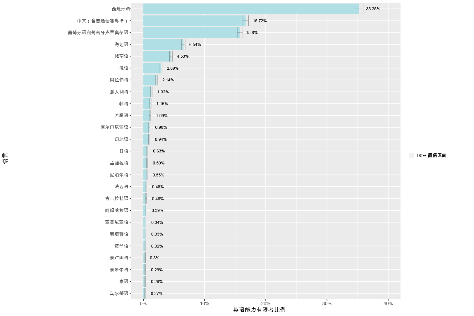 2010 年公共使用微数据区域用于确定 LEP 人员的人数和百分比,以及他们使用的语言,包括: