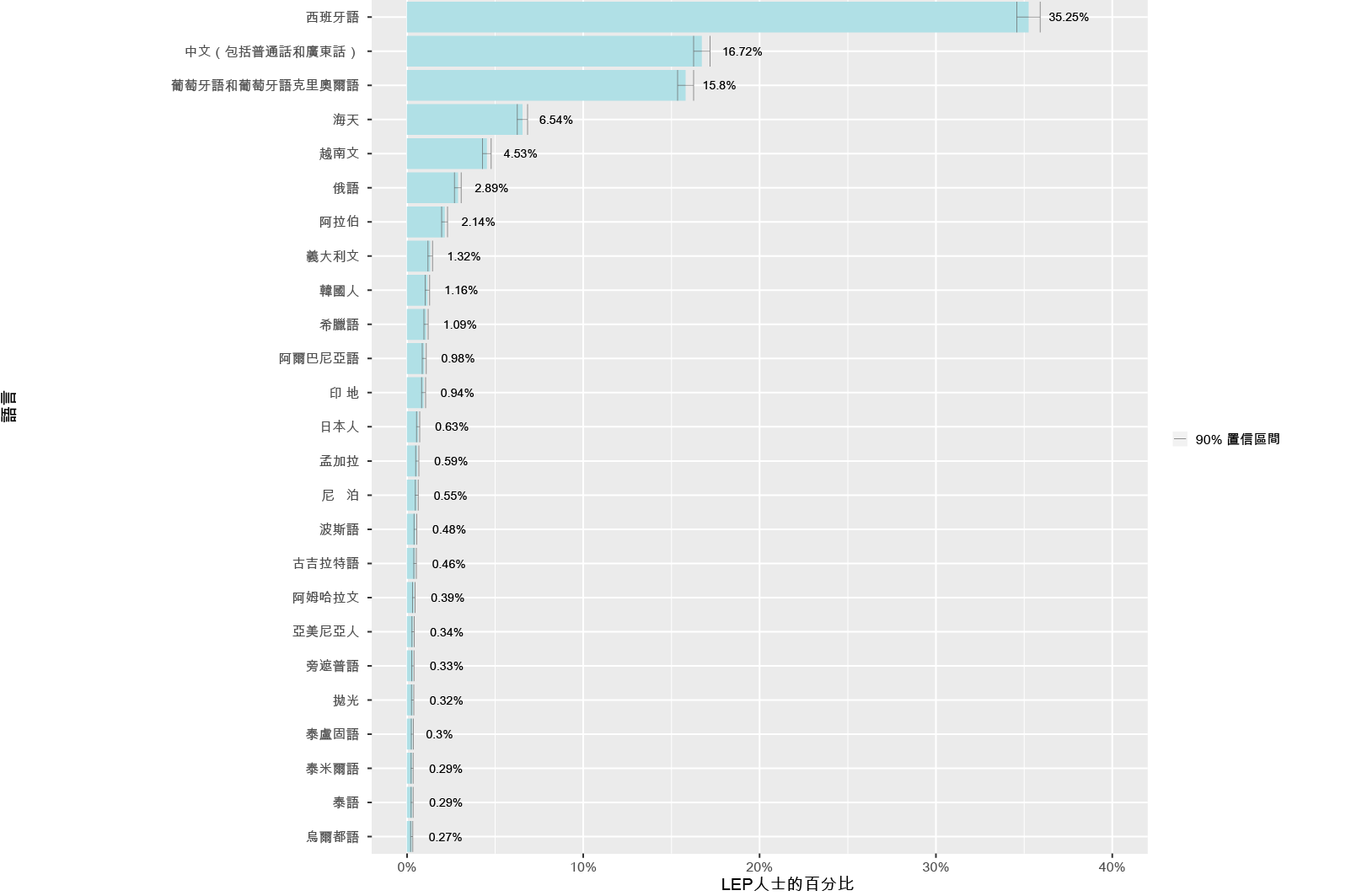 用於確定英文水平有限 (LEP) 人士之人數與比例及其所說語言的 2010 年公共用途微數據區域包括