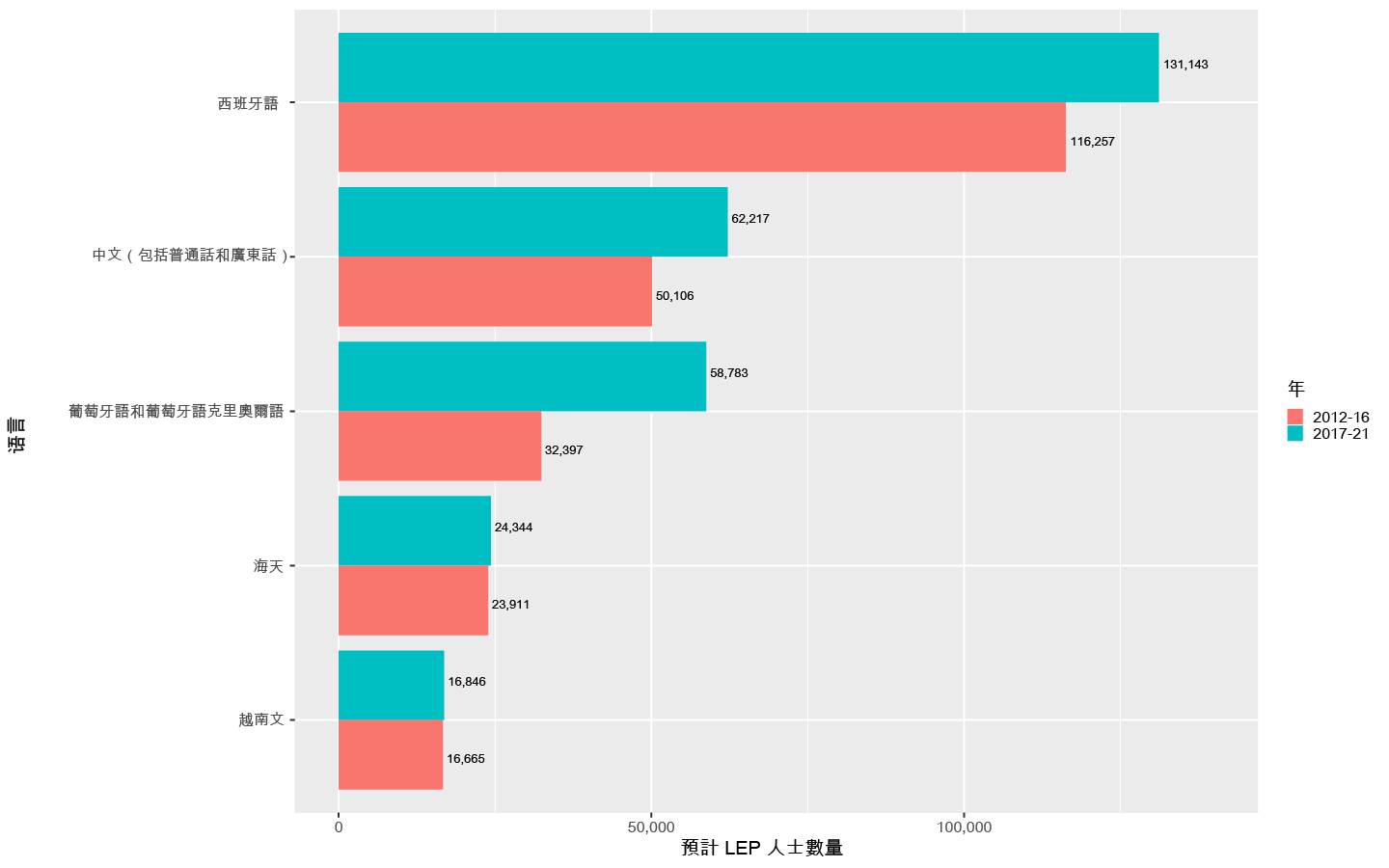 自 2012–2016 ACS 以來,說葡萄牙語的人口漲幅最大,從大約 32,000 人上漲到了 58,000 個 LEP 人士,漲幅達到 81.4%。其他上漲幅度較大的語言是中文、印地語、孟加拉語、泰盧固語與波斯语。跌幅最大的語言有義大利語、阿拉伯語、日語、波蘭語與俄語。