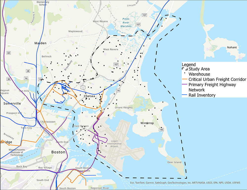 The area’s navigable waterways include the Mystic River, Chelsea Creek, and Boston Harbor. The study area includes commuter and freight rail lines, Interstates 90 and 93, and Routes 1, 1A, 16, and 99.