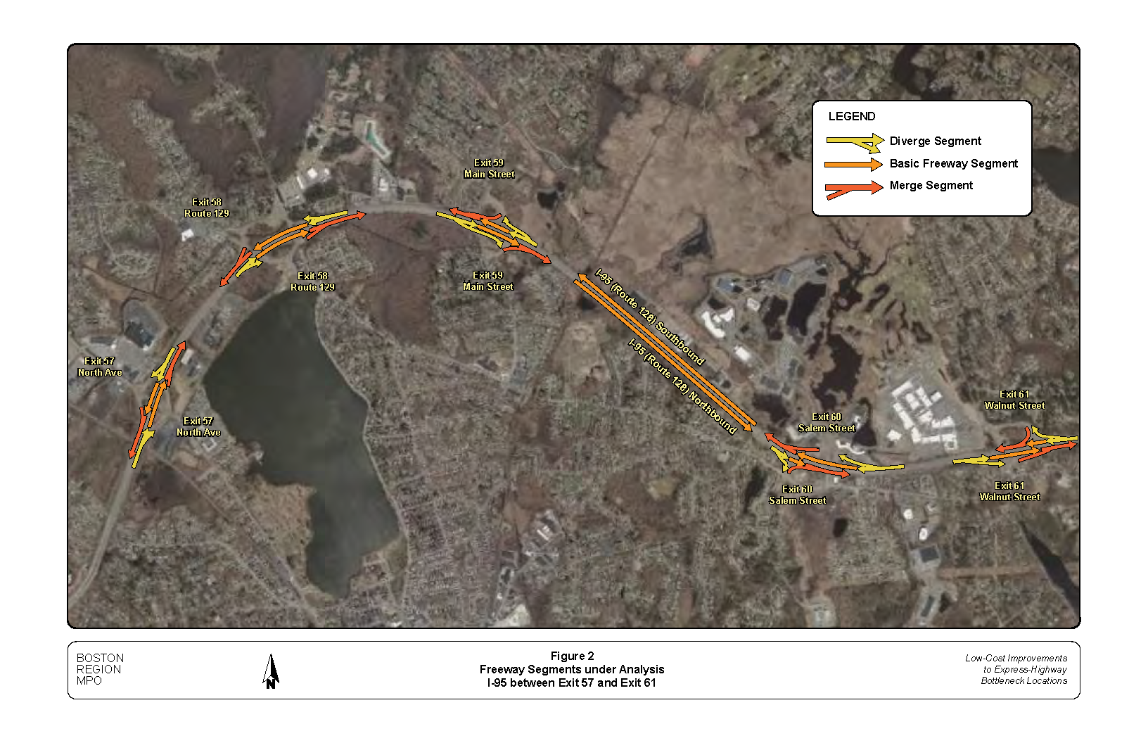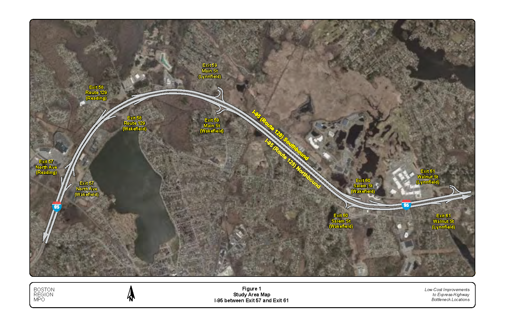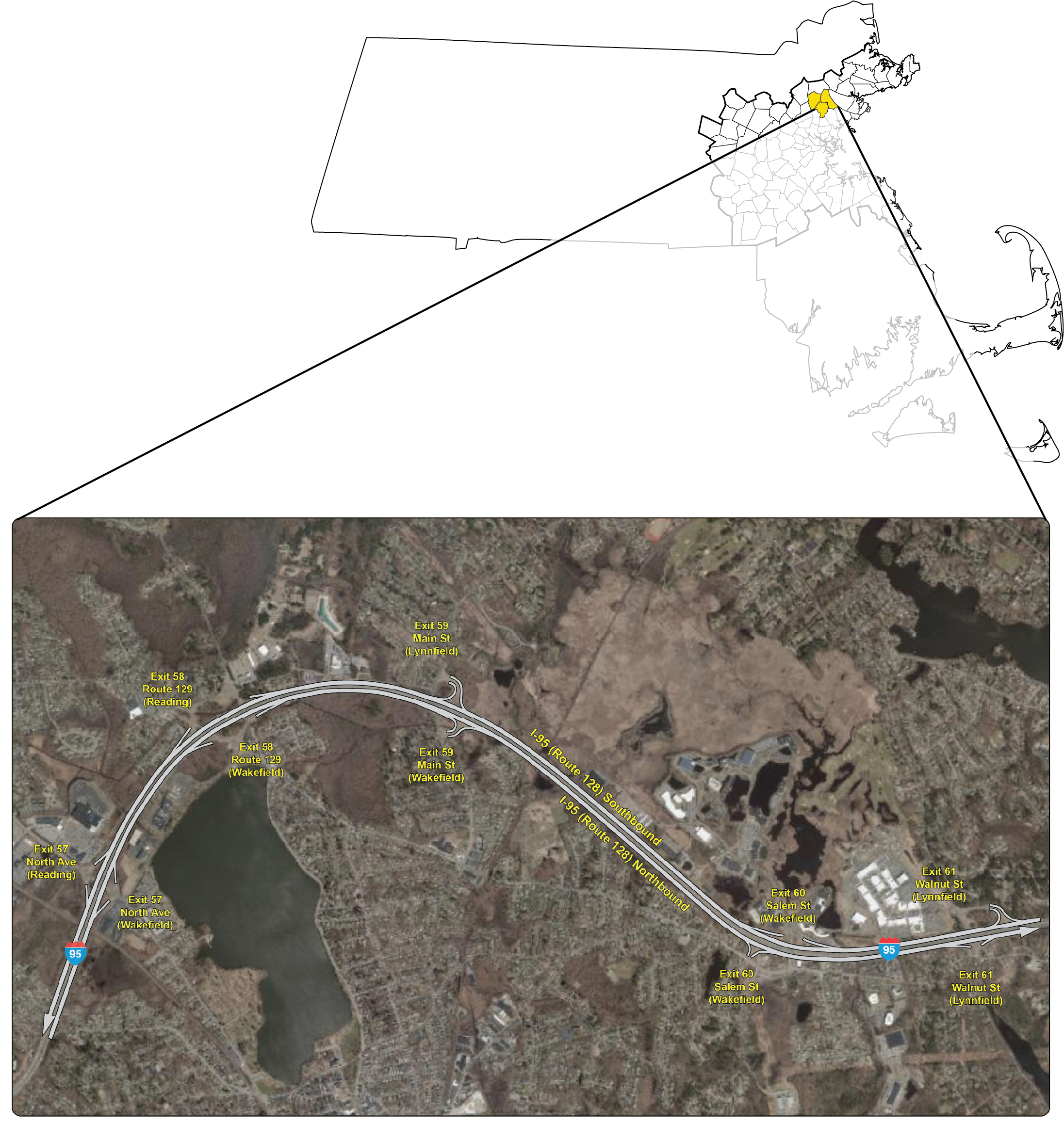 After further review of the areas adjacent to the two locations and discussions with MassDOT Highway Division District 4 staff, MPO staff selected the northbound and southbound sections of I-95 between Exit 57 and Exit 61 for a comprehensive and systematic analysis to identify bottleneck locations for low-cost improvements. Travelers on this section of I-95 regularly experience poor levels of service and endure additional delays while entering or exiting the freeway during the weekday AM and PM peak travel periods.