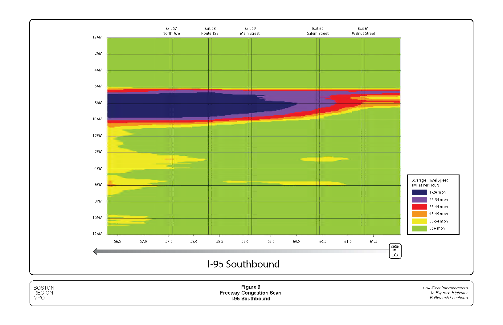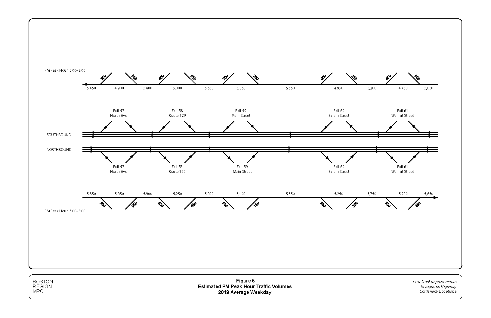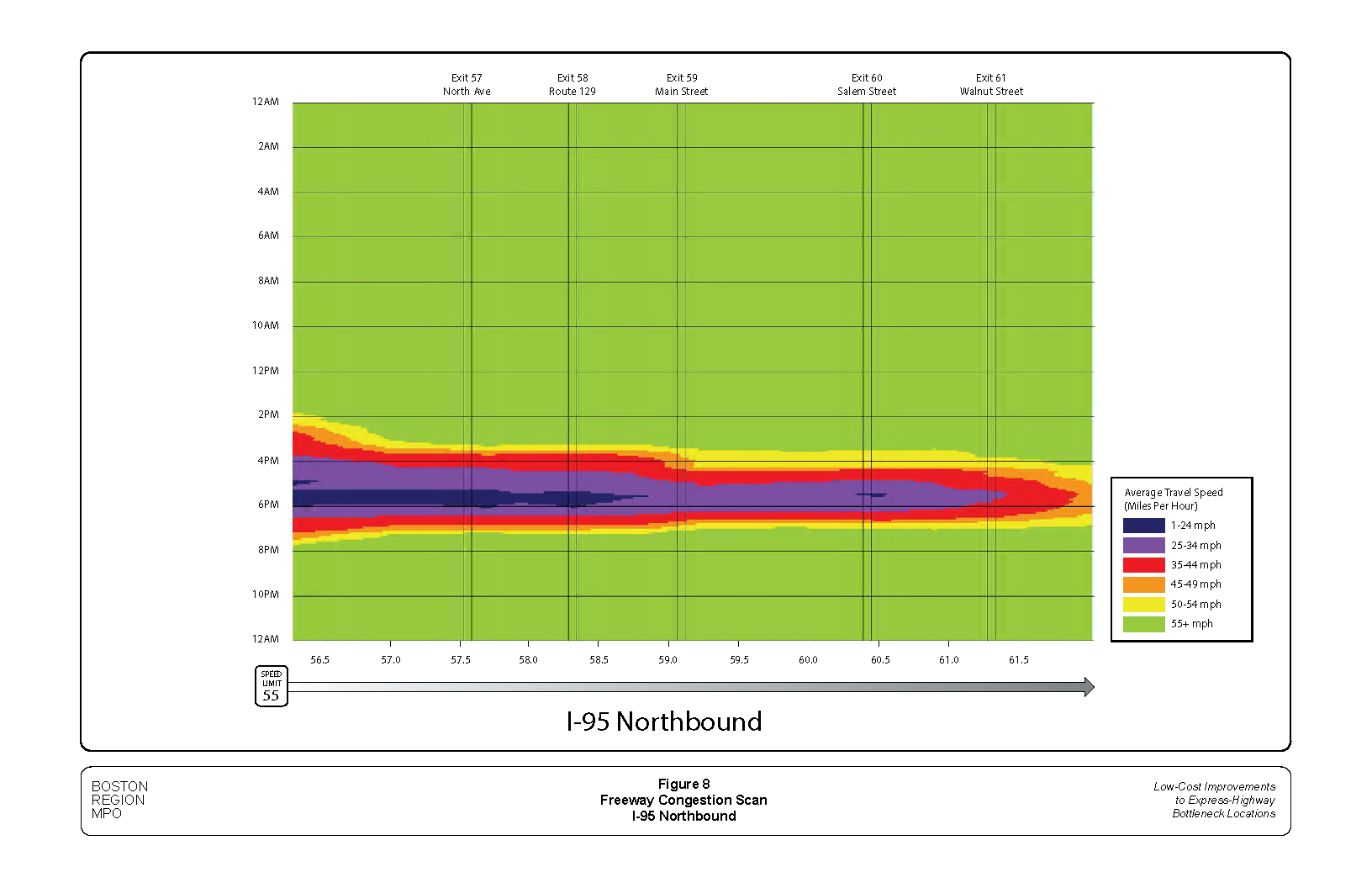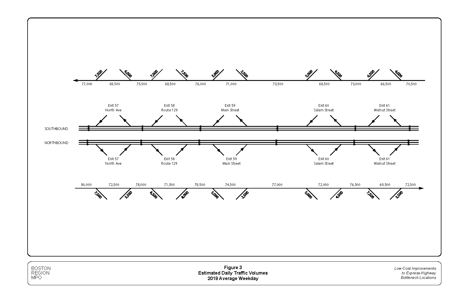 After further review of the areas adjacent to the two locations and discussions with MassDOT Highway Division District 4 staff, MPO staff selected the northbound and southbound sections of I-95 between Exit 57 and Exit 61 for a comprehensive and systematic analysis to identify bottleneck locations for low-cost improvements. Travelers on this section of I-95 regularly experience poor levels of service and endure additional delays while entering or exiting the freeway during the weekday AM and PM peak travel periods.