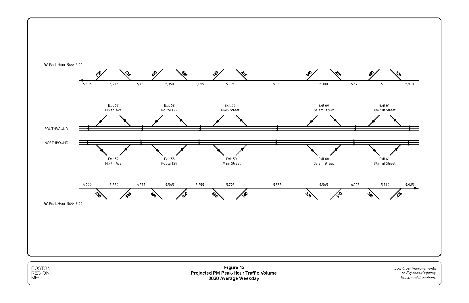 Staff chose 2030 as the future year and projected traffic volumes for the various freeway analysis segments by using growth factors estimated from the Boston Region MPO’s regional transportation planning model. The models projected that traffic in the study area would increase by seven percent (about 0.6 percent annually) on the northbound side and six percent (about 0.55 percent annually) on the southbound side in the AM peak hour, and by six percent on the northbound and seven percent on the southbound in the PM peak hour from 2019 to 2030. Figures 12 and 13 show the projected AM and PM peak hour traffic volumes at the different locations in the study area on an average weekday in 2030.