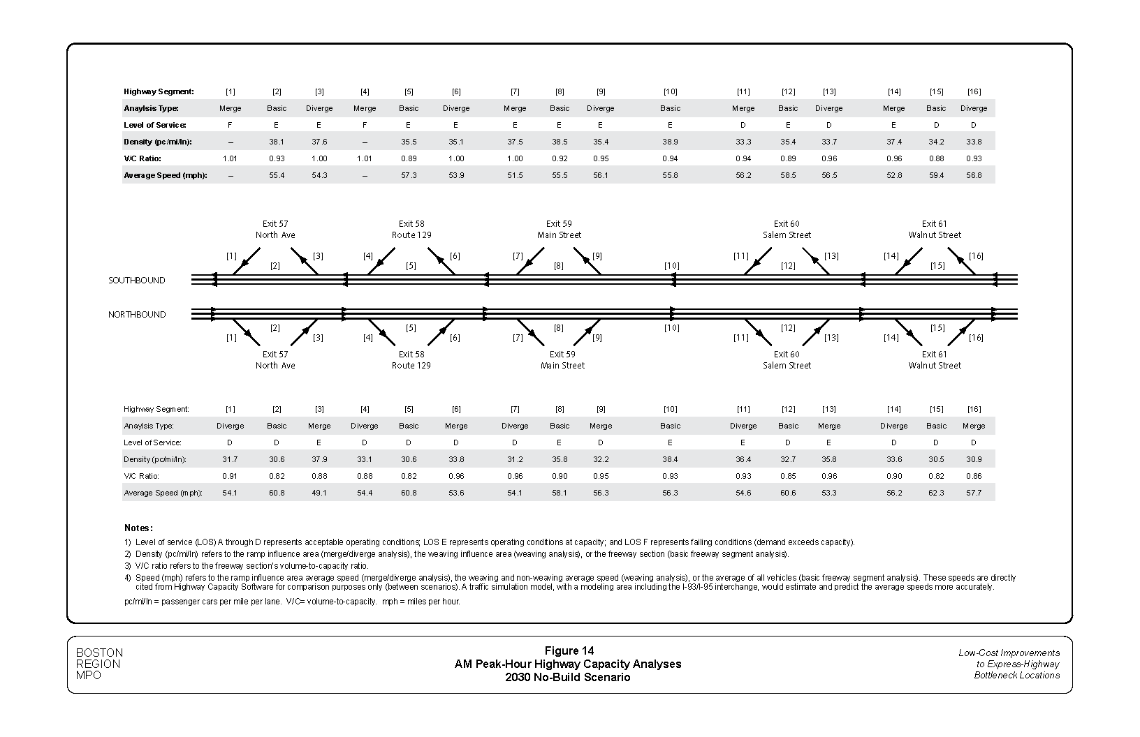 The AM peak hour analyses (Figure 14) indicate that several locations on I-95 southbound would deteriorate from LOS D to LOS E with their adjacent freeway sections near capacity under the projected 2030 traffic conditions. Noticeably, the diverge segment at Exit 57 (Segment 3), the diverge segment at Exit 58 (Segment 6), and the merge segment at Exit 59 (Segment 7) would operate at LOS E with the adjacent freeway sections at capacity. Moreover, the merge segments at Exit 57 (Segment 1) and at Exit 58 (Segment 4) would fail at LOS F with the volume-to-capacity ratio of the adjacent freeway sections equal to 1.01.