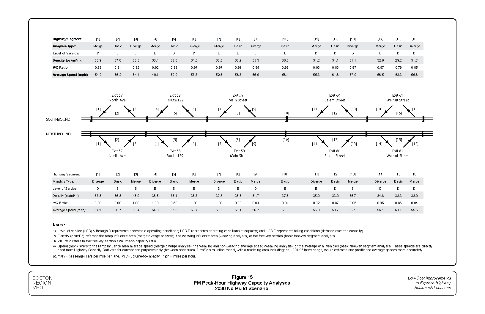 The PM peak hour analyses (Figure 15) indicate that many merge and diverge segments on both I-95 northbound and southbound would deteriorate from LOS D to LOS E. Noticeably, in the peak direction (northbound) the merge segment at Exit 57 (Segment 3) and the diverge and merge segments at Exit 58 (Segments 4 and 6) would operate at LOS E with the adjacent freeway sections reaching capacity limits.