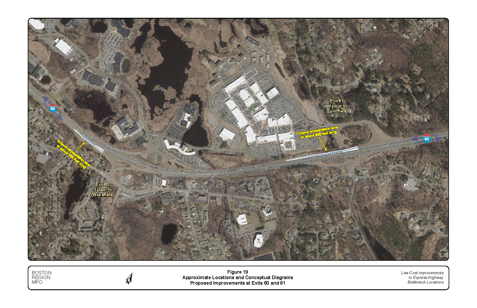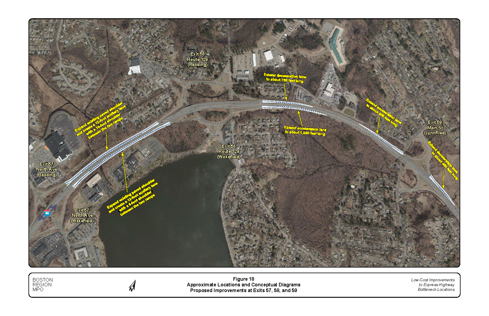 Bottlenecks on the freeway network can occur where geometric elements, such as ramps or lane drops, restrict traffic flow and become a major contributor to recurring congestion. Candidate locations in this study were identified based on input from the MassDOT Highway Division and review of the MPO’s Congestion Management Process data. The screening process yielded two locations on Interstate 95 (I-95) that had the potential for low-cost improvements: 1) I-95 southbound between Exit 58 (Route 129) and Exit 57 (North Avenue) in Wakefield and Reading, and 2) I-95 northbound at Exit 61 (Walnut Street) in Lynnfield.