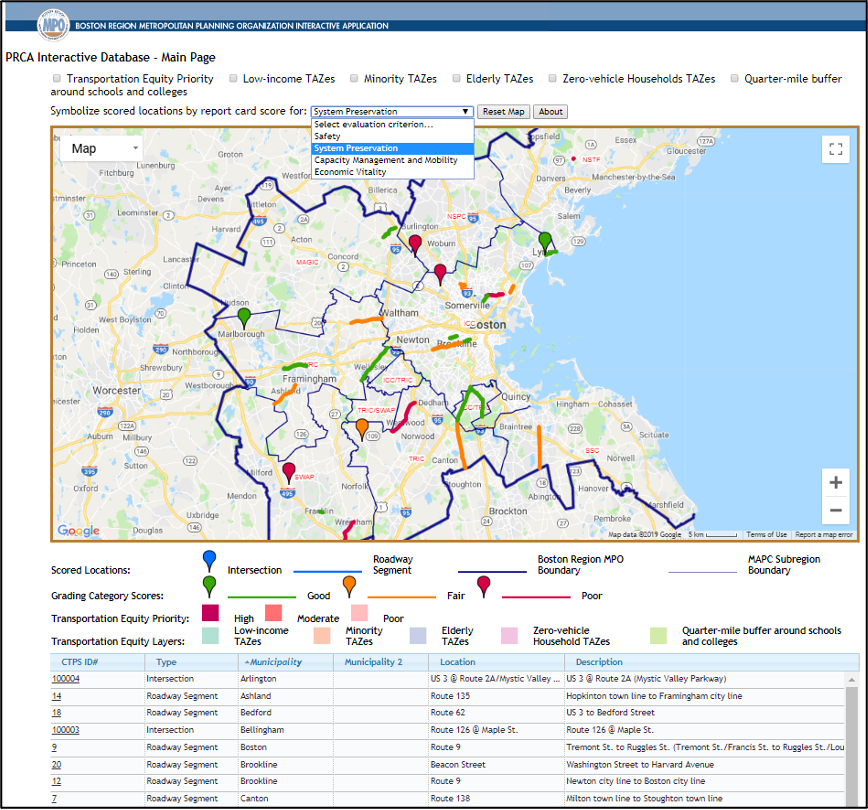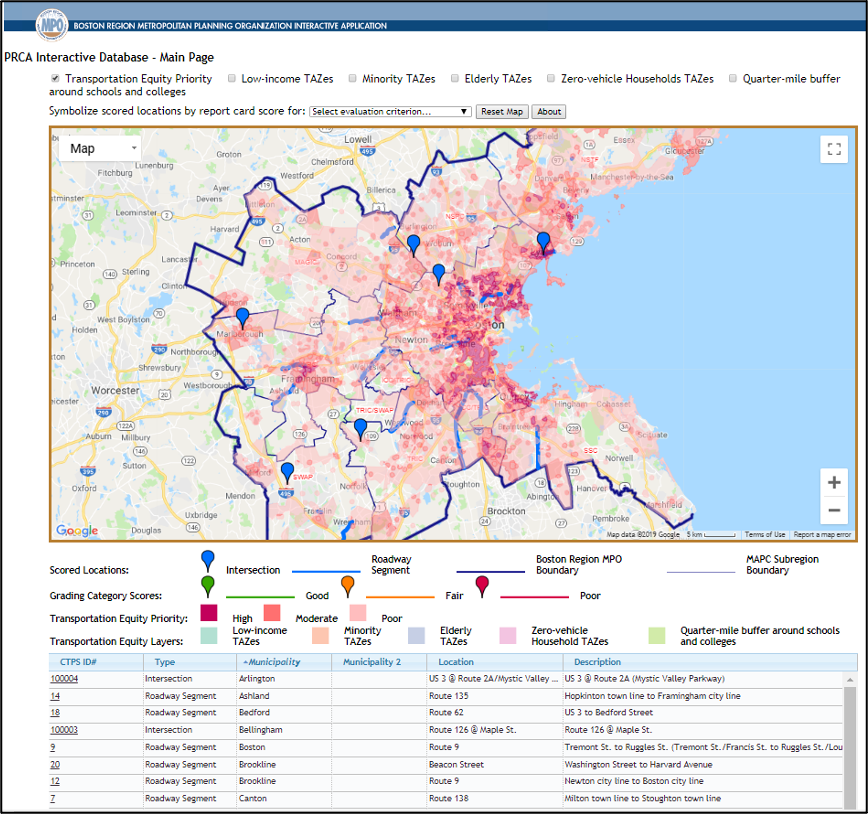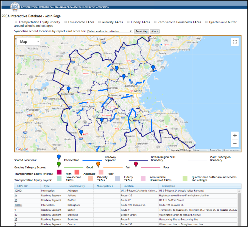 This information is displayed for the Boston region in the PRCA Interactive Database. Intersections are represented as points and roadway segments are shown as line work for the length of roadway studied. Figure 1 shows how basic identifying information about every graded location—such as whether it is a roadway segment or an intersection, the municipality where it is located, the name of the roadway or the intersecting streets, and a description of where a roadway segment begins and ends—is displayed in a table below the interactive map that includes every graded PRCA location in the Boston region.