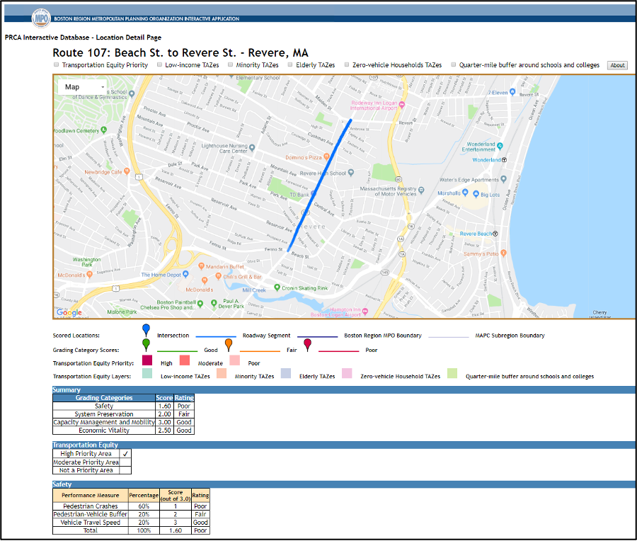 Users can click on the map icons for a specific PRCA or its unique identifier listed in the table to be taken to a page that includes detailed grading information for an intersection or roadway segment. Each page for a specific intersection or roadway segment PRCA features a map of the location above the information presented on the report cards. That information includes overall grades for the four grading categories, the transportation equity priority level (a location’s level of priority within the Boston region for safe and comfortable pedestrian travel), the unique grades assigned to the performance measures for each grading category, and the transportation equity factors present at the location. The top of the page illustrated in Figure 1 for the segment of Route 107 that runs from Beach Street to Revere Street in Revere is illustrated in Figure 2 below.